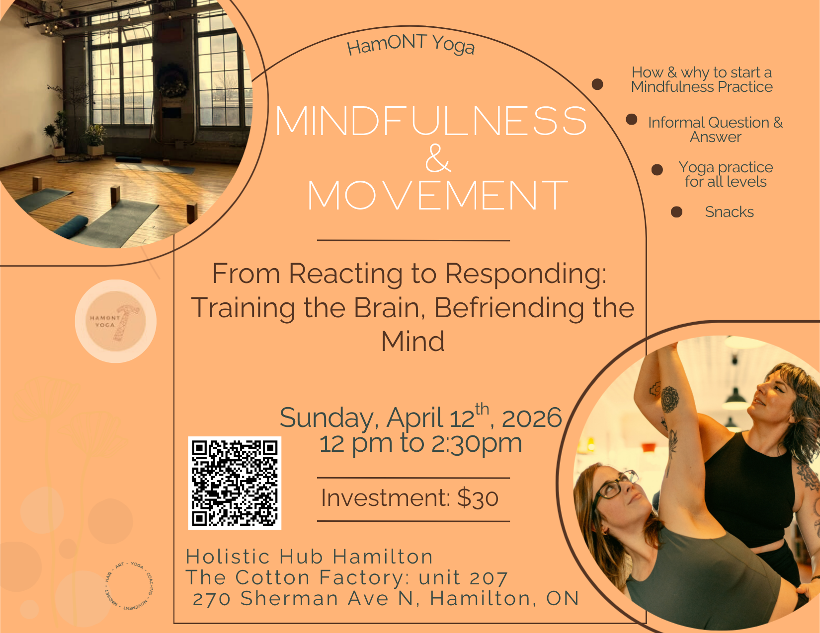 I will be co-hosting these upcoming workshops at the Holistic Hub with Stephanie Weiler of HamOnt Yoga Collective. Explore what mindfulness is, how to start a meditation practice and enjoy a yoga class, community and an informal question and answer over snacks.